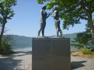 El lago Towada y una estatua de bronce de doncellas que el poeta famoso