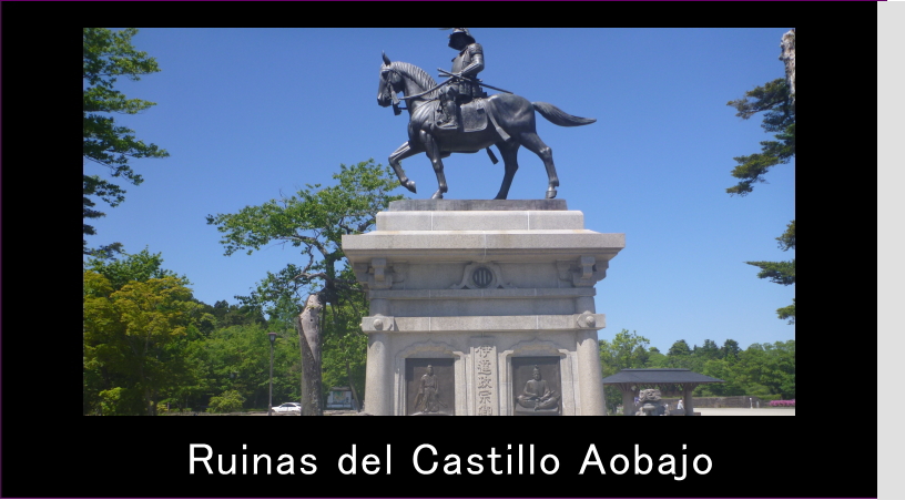 Masamune Date. Centro de los ruinas del Castillo Aobajo, está una statua