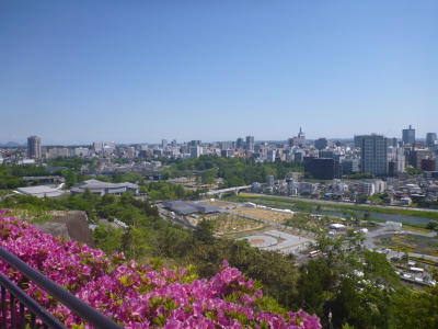 de bronce a caballo de Masamune Date. Visitantes pueden ver un barrio de